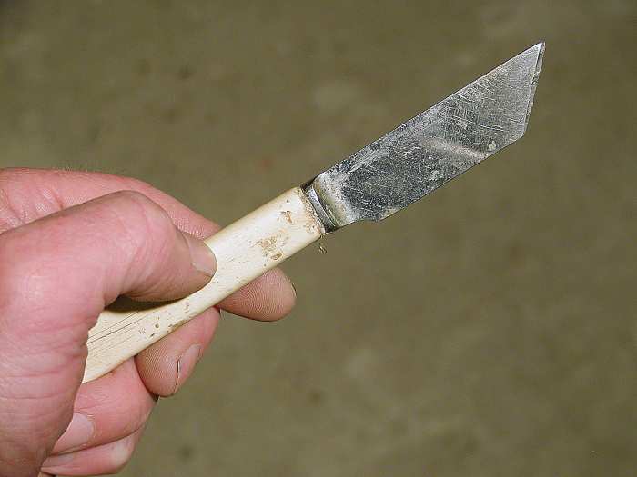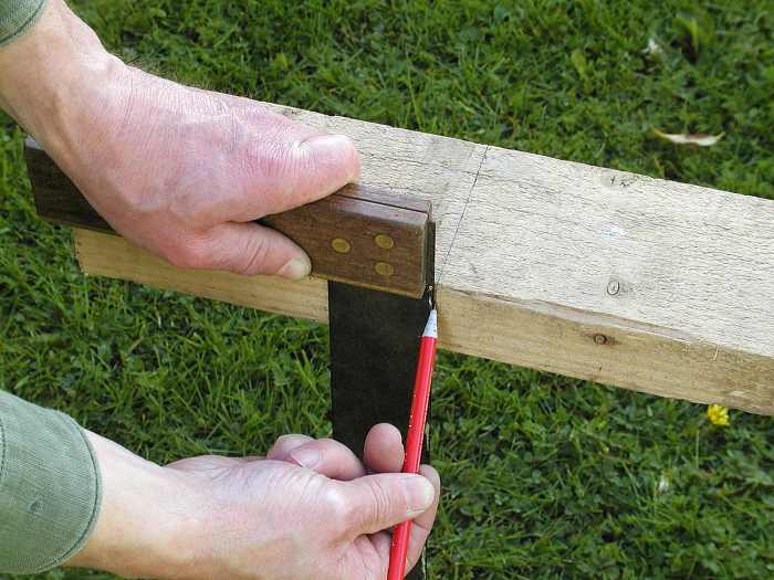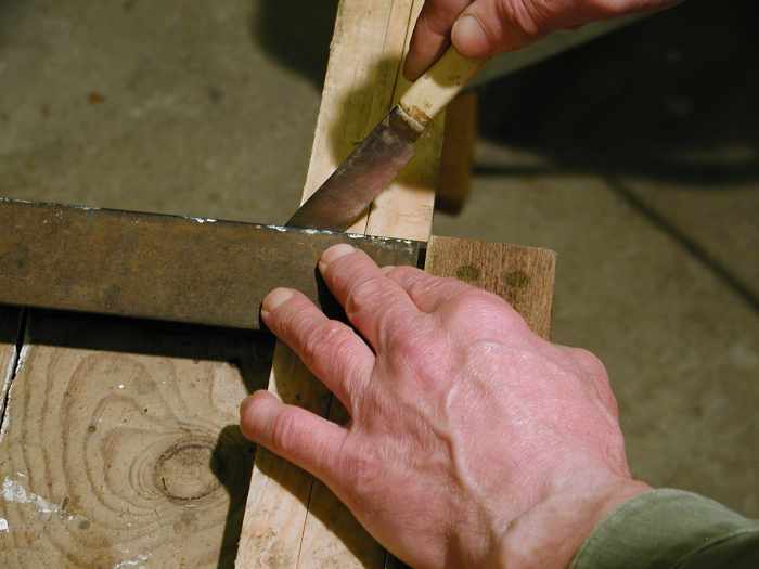 A pencil is fine for rough work, notwithstanding, a marker knife never gets blunt and produces a fine line, allowing you to produce more accurate results when cutting joints. You can make one by cutting a 45-degree bending on an old dinner pocketknife with an angle grinder and then sharpening it. You could utilize a Stanley knife, however, the reward of a long-bladed, flexible knife is that it tin can reach into tight spaces. (This knife also comes in handy for spreading silicone sealant and putty!)