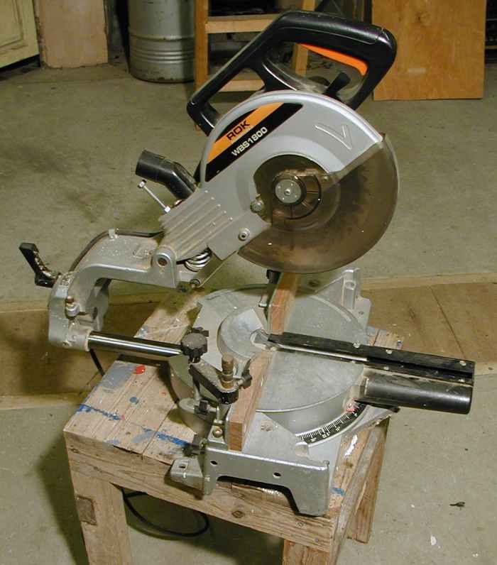 My ain miter saw (chop saw), is the blazon with the blade that lowers down and cuts straight through, not a sliding type. It is stored in the locked-downwardly position.