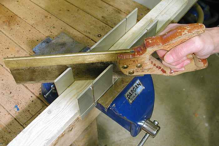 This gives improved accuracy when cut. A miter box has slots in its vertical sides which deed equally guides and prevent the bract of a saw from sloping from the vertical. Metal, wood and plastic versions are available. Some need to be held in a vise while others take a "hook" or raised edge on the underside which can be butted up against the edge of a bench.