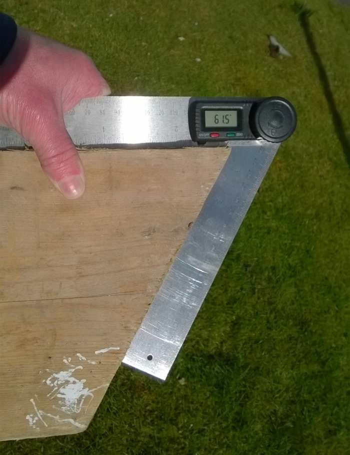 An angle finder can exist used to measure out cut timber, and also equally a bevel gauge to transfer angles when information technology'south necessary to cut more pieces.