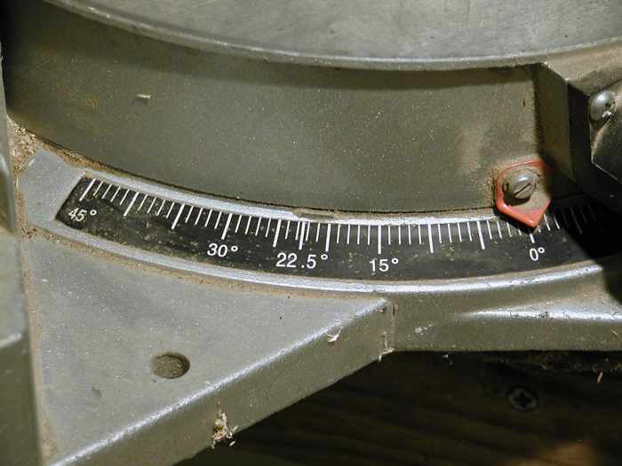 This scale indicates the miter angle. 0 degrees is for cut correct angles. The tabular array can be turned to make cuts upwardly to 45 degrees