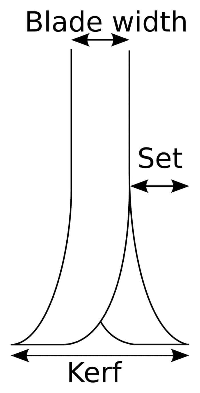 Kerf of a saw. The diverging teeth cut a slot in timber, wider than the thickness of the blade, so the blade doesn't bind.